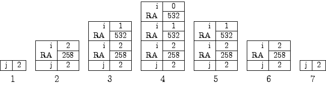 The evolution of the stack of ARs is shown below. we have assumed that 258 is the address of the statement that follows the activation of recursive(j) in main(), and that 532 is the address of the statement that follows the activation of recursive(i-1) in recursive(). Since the invoked methods do not return any value (the return type is void), the ARs do not contain a memory location for such a value. Moreover, we have not indicated to which method each AR refers, since the AR at the bottom of the stack is for the main() method, and all the others are for the successive activations of recursive().