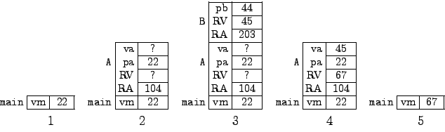 We analyze in detail what happens when A(vm) is activated from the main() method. Before the activation, the stack of ARs is as shown in 1 in the above figure: